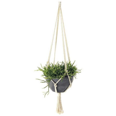 コットン製吊り具と自然素材風コンテナの組み合わせが魅力的な、室内専用のハンギングポットです。