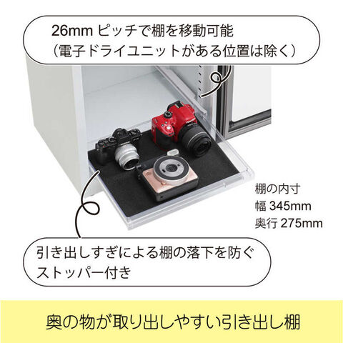 庫内湿度を30%~50%を任意に設定可能でき、レンズのカビと電子部品の劣化防止にメンテナンスフリーで安定した除湿性能を発揮する全自動防湿庫。