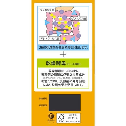 3種の乳酸菌が腸内環境を整える。乾燥酵母(ビール酵母)が乳酸菌の発育促進に効果を発揮する。