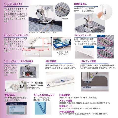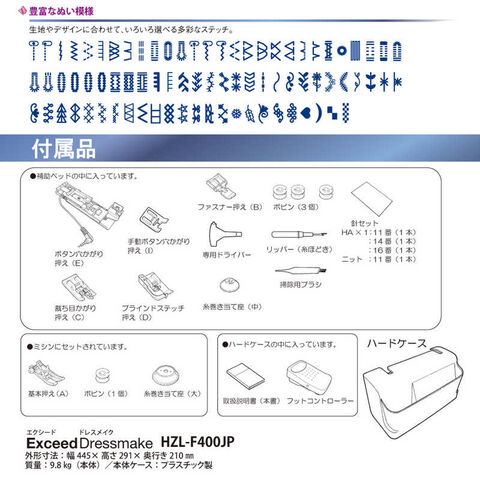 付属品:基本押え(本体に装着)・ボタン穴かがり押え・手動ボタン穴かがり押え・裁ち目かがり押え・ブラインドステッチ押え・ファスナー押え・ボビン・専用ドライバー・リッパー・掃除用ブラシ・針セット・糸巻き当て座(大)(中)・フットコントローラー・取扱説明書・DVD