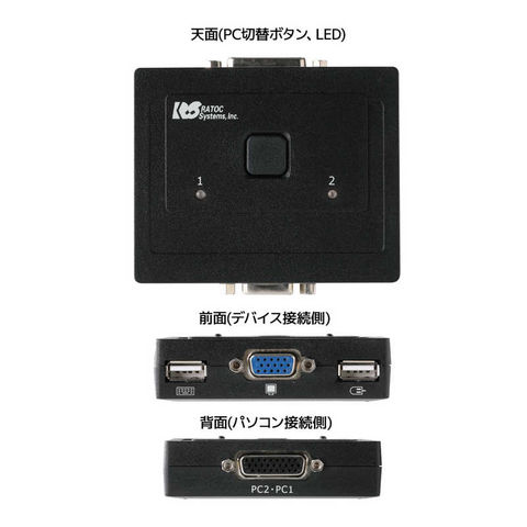 仕様2:[最大PC接続数]2台[最大解像度]2048×1536@85Hz[切替方式] 本体ボタン ホットキー([Scroll Lock]×2回) ※Windowsのみ対応[切替音]なし(静音仕様)[LED表示]緑(選択ポートのLEDが点灯)[接続コネクタ] パソコン側:ミニD-sub15ピン、USB Type-A コンソール/周辺機器側:ディスプレイ=ミニD-sub15ピン、キーボード・マウス=USB Type-A