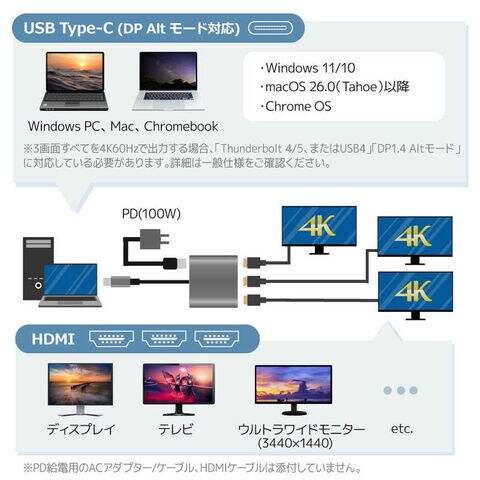 3画面すべてを4K(3840×2160)/60Hzで出力する場合、パソコンのUSB Type-C/USB-Cポートは高帯域規格(1)Thunderbolt 4、Thunderbolt5、またはUSB4(2)DP1.4 Altモードに対応している必要があります。