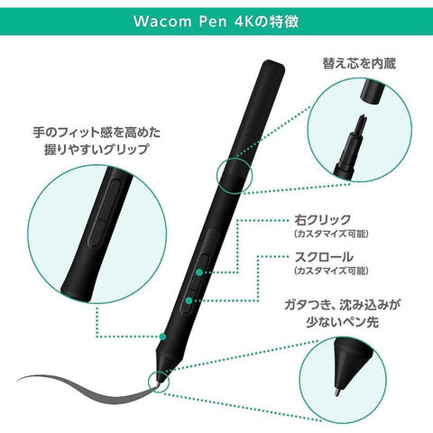 付属品:[構成]ペンタブレット本体(Bluetooth非対応)Wacom Pen 4KUSBケーブル(ケーブルバンド付。1.5m)替え芯(標準芯3本。ペンの中に同梱)芯抜き(ペンの後ろ側に搭載)クイックスタートガイドレギュレーションシート保証書オンラインユーザマニュアル、重要な製品情報 (ワコムデスクトップセンター内)