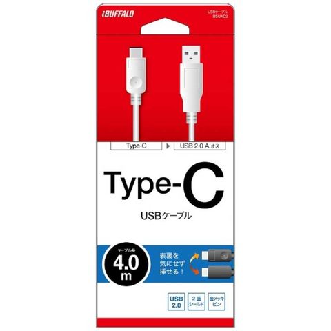 BUFFALO 4.0m[USB-C⇔USB-A]2.0ケーブル 充電・転送 ホワイト BSUAC240WH