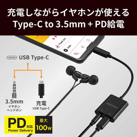 BUFFALO Type-Cto3.5mm+PD給電 オーディオ変換アダプター ブラック BSMPCPD350BK