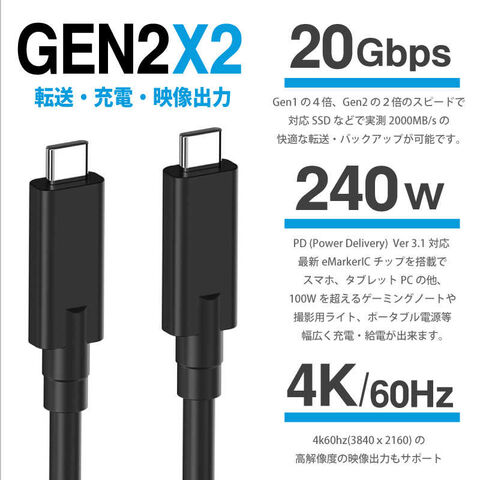 仕様1:・USB3.2 Gen2x2 Type-C オス-オス・充電&通信可能・Power Delivery 3.1 EPR 最大240W(5A/48V)充電・最大20Gbps転送・eMarker IC内蔵・USB-IF認証チップ使用・4K/60Hz[重量]70g[ケーブル長]2m