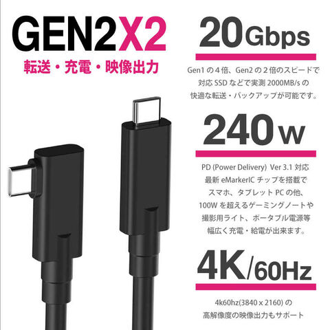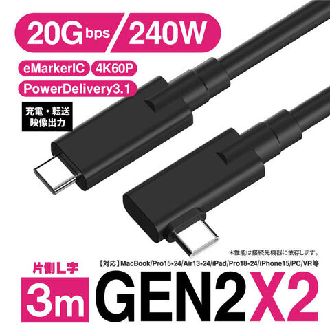 仕様1:・USB3.2 Gen2x2 Type-C オス-オス・充電&通信可能・Power Delivery 3.1 EPR 最大240W(5A/48V)充電・最大20Gbps転送・eMarker IC内蔵・USB-IF認証チップ使用・4K/60Hz[重量]100g[ケーブル長]3m(片側L字)