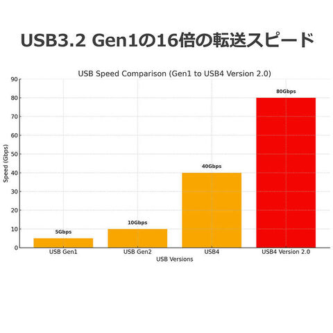 USB4の2倍の転送スピード(80Gbps)で、T5対応ストレージなどで実測6000MB/s以上の高速で安定した転送・バックアップが可能です。