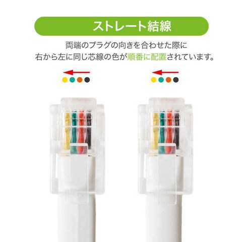 受話器用の4極4芯コードには「クロス結線」と「ストレート結線」という2種類の配線方法が存在しており、それぞれ使用可能な機種が異なります。本製品は2つの結線方法の中でも採用機種の比較的少ない「ストレート結線」に対応したコードです。