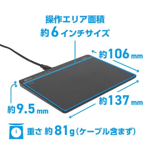 仕様1:[タッチパッド有効面積]約横幅135mm×奥行90mm[インターフェイス]USB2.0準拠[本体サイズ]約横幅137mm×奥行106mm×厚さ9.5mm[対応OS]Windows11/10専用[接続端子]microUSB端子(本体側)[重量]約81g[ケーブル長]約1.5m[同梱品]製品本体、専用ケーブル、取扱説明書兼保証書
