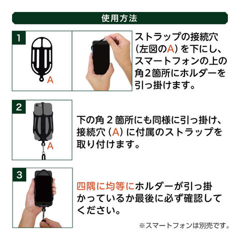 ●スマホを引っ掛けるだけの簡単着脱ストラップ穴もケースの取り外しも不要。スマホの四隅に引っ掛けるだけの着脱カンタン設計。※ブック型のスマホケースにはご使用になれません。
