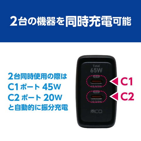 2台同時使用の際はC1ポート45W、C2ポート20Wと自動的に振分充電します。