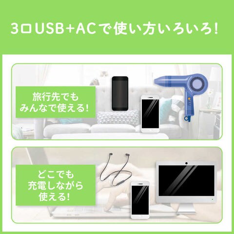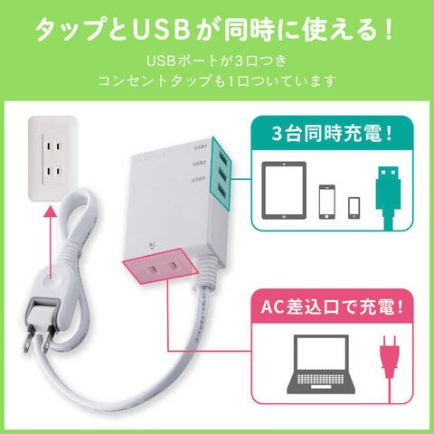 ACタップとUSBポートが一体になった、パソコンやスマートフォン、タブレットを同時に充電できるコード付きモバイルUSBタップです。iPhone/Androidスマートフォン/タブレットを急速充電可能です。