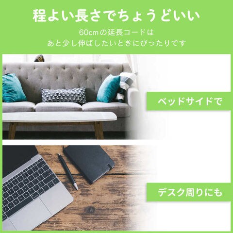●コンセントから離れた場所でも充電できる長さ60cmのコード付きタイプです。