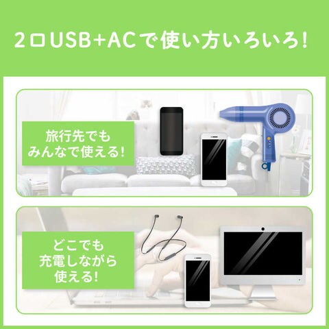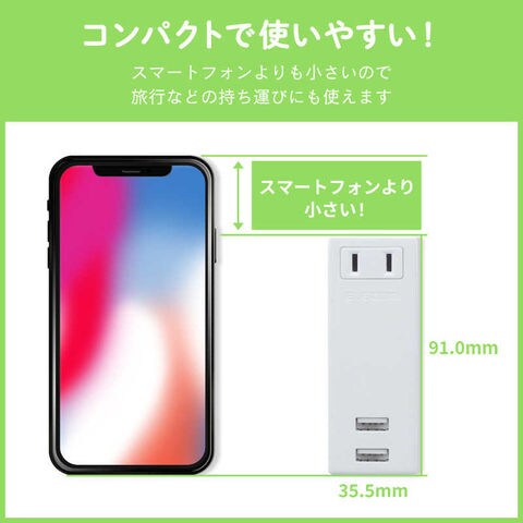 ACタップとUSBポートが一体になった、パソコンやスマートフォン、タブレットを同時に充電できるモバイルUSBタップです。iPhone/Androidスマートフォン/タブレットを急速充電可能です。