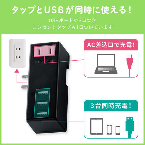 エレコム ELECOM USB充電ポート付モバイルタップ (2ピン式・1個口・USB3ポート) [MOTU042132BK] MOT-U04-2132BK ブラック