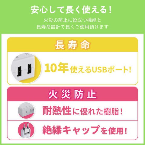 仕様1:■対応機種:USBポートを利用して1.5A以下の出力で充電できる機器 ■コネクタ形状:USB Aメス*3 ■定格入力電圧:AC100V 50/60Hz ■定格出力電圧:AC 100V / DC 5V ■定格出力電流:AC 14A / DC 2.1A(1ポート最大1.5A) ■保証期間:1年間 ■本体差込口形状:2ピン(2P、2pin) ■本体差込口個数:1個口(1口、1コ口) ■プラグ仕様:2ピン(2P、2pin)・スイングプラグ