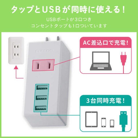 ACタップとUSBポートが一体になった、パソコンやスマートフォン、タブレットを同時に充電できるモバイルUSBタップです。iPhone/Androidスマートフォン/タブレットを急速充電可能です。