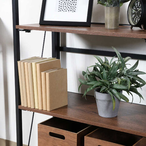 全体をスッキリ見せるスチールと組み合わせることで、リアルな木目模様がプリントされた棚板がよく引き立ちます。