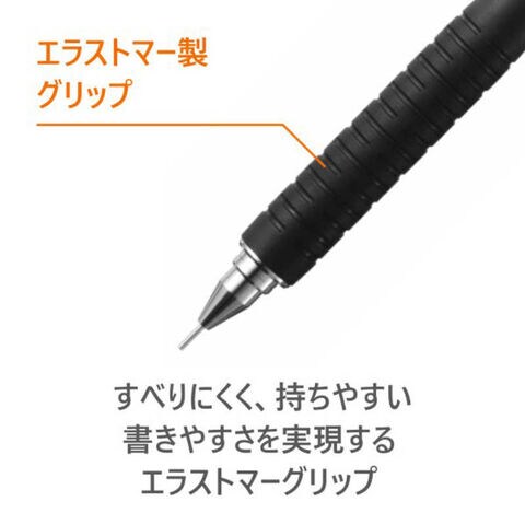 太め長めのエラストマー製グリップは握り位置を選べるので自分の筆記ベストポジションが見つかり、グリップの切り込みパターンは握りやすさ満載。ノック部分はデザイン性と安全性を兼備した空洞付き。 視覚を広く保ち、定規に密着しやすい4mmスリーブ、芯硬度を表示する硬度表示窓付きです。
