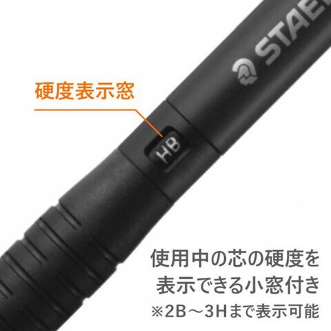 太め長めのエラストマー製グリップは握り位置を選べるので自分の筆記ベストポジションが見つかり、グリップの切り込みパターンは握りやすさ満載。ノック部分はデザイン性と安全性を兼備した空洞付き。 視覚を広く保ち、定規に密着しやすい4mmスリーブ、芯硬度を表示する硬度表示窓付きです。