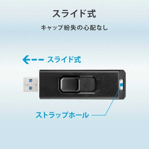 約23.5×68.8mmと、USBメモリー同等の小型サイズ。スライド式のため、キャップ紛失の心配もありません。