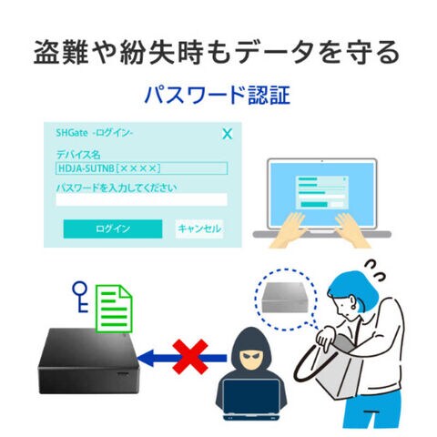 この「ハードウェア自動暗号化」と「パスワードロック」のダブルのセキュリティ機能で、万が一ハードディスクを盗難されたり紛失したりした場合でも、重要なデータの流出を防ぐことができます。