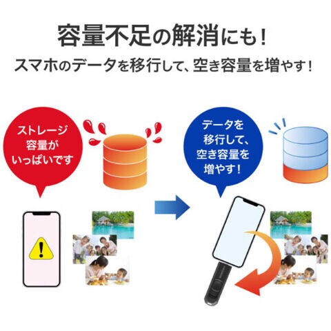 本商品に写真や動画などのデータを保存することで、スマホ・パソコンの容量不足を解消できます。