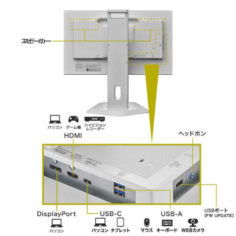 パソコンとの接続に便利なUSB Type-CとDisplayPort、AV機器との接続に便利なHDMIを搭載しています。