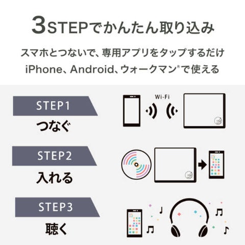 iPhoneやAndroidスマホ、ウォークマン(R)に音楽CDの曲を入れられるスマホ用CDレコーダーです。