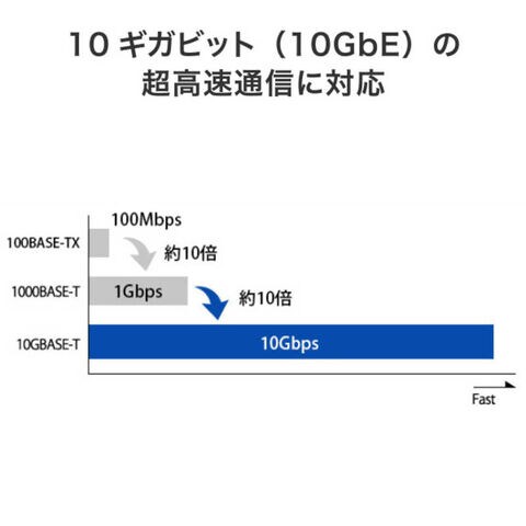 Gigabit(1000BASE-T)に比べて約10倍高速な10ギガビット(10GBASE-T)に対応。