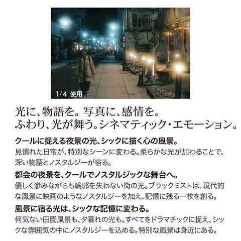 ●こんな表現におすすめ: クール、シネマティック、ノスタルジック、落ち着き、印象的な夜景、シックな色合い