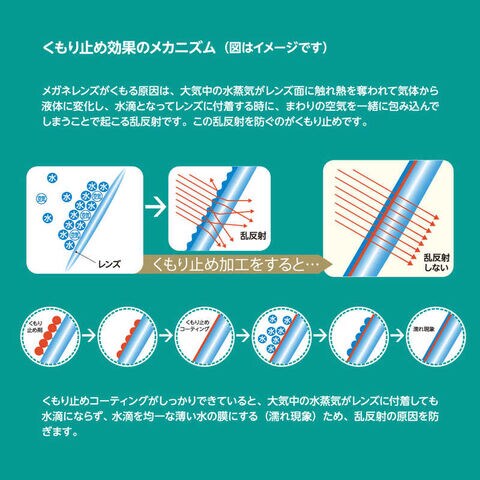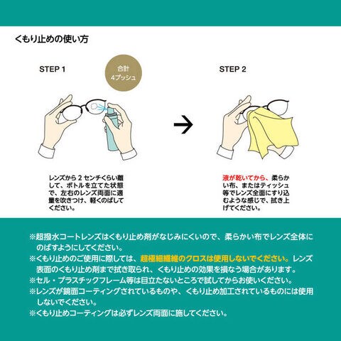 ●拭きあげの際にメガネクロス(超極細繊維)を使用すると、レンズ表面のくもり止め剤まで拭き取られ、くもり止めの効果を損なう場合があります。