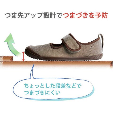 ●底面には安全な歩行をサポートする素材を使用。アウトソールの内側には脱ぎやすさをサポートするキック付き。