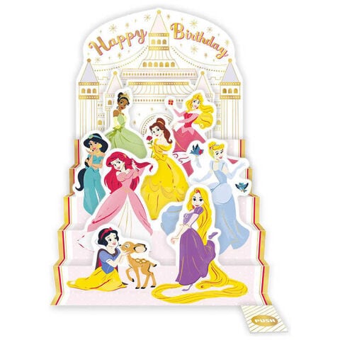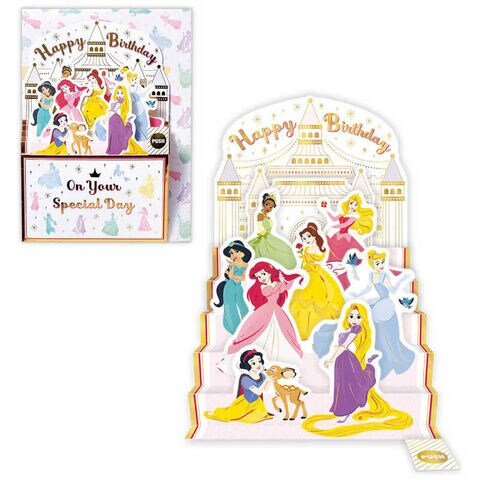ディズニープリンセスたちがお祝いしてくれるカラフルで華やかなバースデーカード!