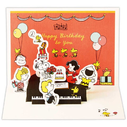 スヌーピーと仲間たちがグランドピアノを囲んで誕生日をお祝いしてくれます。