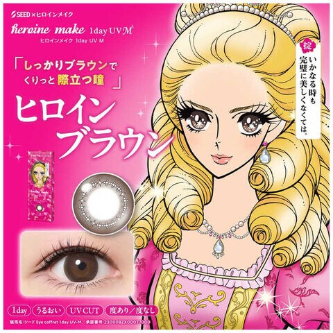 「ヒロインメイク ワンデーUV M」は、「誰よりも輝く大きな瞳になりたい」そんな女の子たちの夢を叶えるため、コンタクトレンズメーカーシードとメイクブランドのヒロインメイクが共同開発した、天然うるおい成分配合の超薄型UVカット付きサークルレンズです。