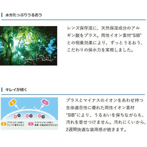 レンズ保存液に、天然保湿成分のアルギン酸をプラス。両性イオン素材“SIB”との相乗効果により、ずっとうるおう、こだわりの保水力を実現しました。
