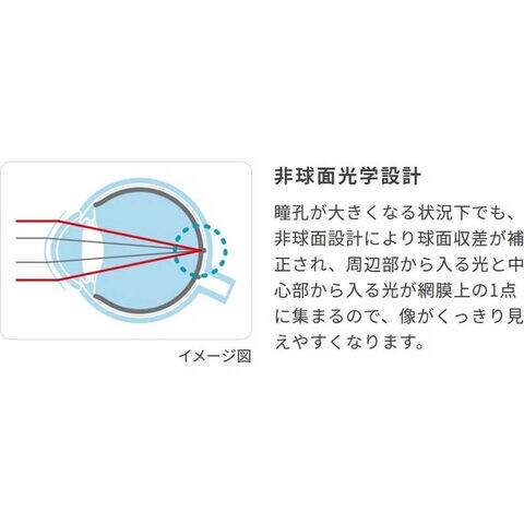球面収差を補正する非球面デザインとなめらかなレンズ表面で、夕方になっても、「にじみ」「ぼやけ」の少ないクリアな視界 *1 をサポートします。