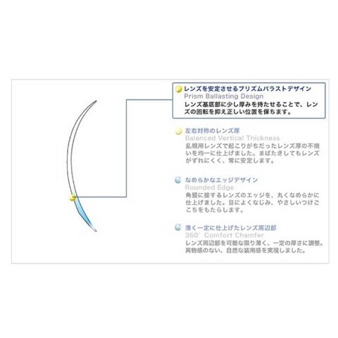 装用中、目の動きによるレンズのズレを防ぐから、いつも正しい位置にレンズが安定します。まばたきするたびに視界がゆがんで見えにくくなるといったトラブルも解消され、クリアな視界がいつまでも続きます。