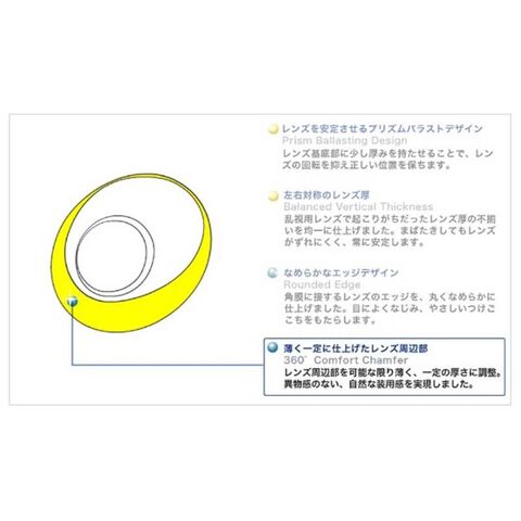 指にのせた時に形状がしっかりと安定。レンズの表裏もわかりやすく、つけはずしが簡単です。レンズの耐久性が向上。取扱いの時にも破損しにくいレンズです。