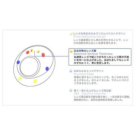 指にのせた時に形状がしっかりと安定。レンズの表裏もわかりやすく、つけはずしが簡単です。レンズの耐久性が向上。取扱いの時にも破損しにくいレンズです。