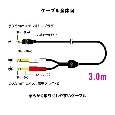 オーディオテクニカ 3m φ3.5mmステレオミニ-φ6.3mmモノラル標準×2 AT-MI62/3.0