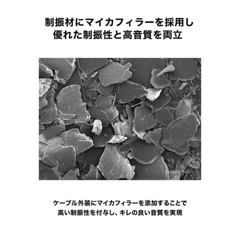 ケーブルのPVCシースにマイカフィラーを添加することで高い制振性を付与しており、これにより高域/低域ともにレンジが広がり、低域の量感が出るためドラムやベースのリズムにメリハリがつきます。