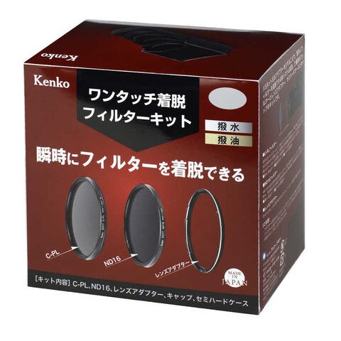 「ワンタッチ着脱フィルターキット」はバヨネット式のアダプターを介することで、素早くフィルターを着脱できる新システムのフィルターキットです。2 種類の専用フィルター(C-PL、ND16)とレンズアダプター、セミハードケースとキャップ(レンズアダプター用)のキットです。