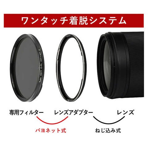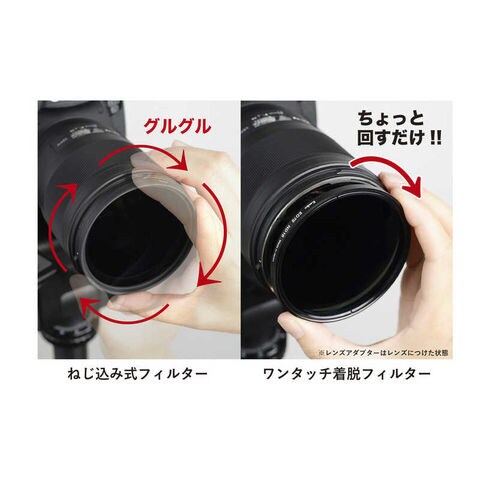 「ワンタッチ着脱フィルターキット」は専用フィルターとレンズアダプターがセットになっており、アダプターをあらかじめレンズにつけておくことで、フィルターはバヨネット式で瞬時に着脱することができます。通常のねじ込み式フィルターのようにグルグル回すことなく素早くフィルターを着脱できます。