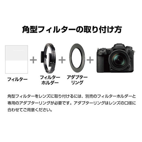 角型フィルターをレンズに取り付けるには、別売のフィルターホルダーとホルダー専用のアダプターリングが必要です。アダプターリングはレンズの口径に合わせてご用意ください。