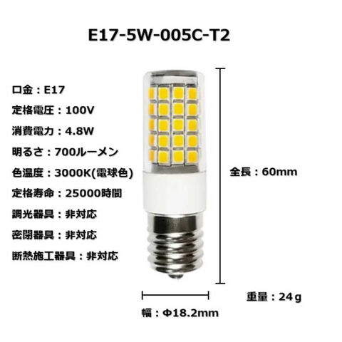 東京メタル 50W相当 LED電球 口金E17タイプ [E17 / T形 / 50W相当 / 電球色 / 1個 / 全方向タイプ] E17-5W-005C-T2