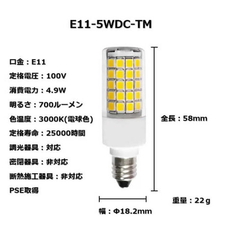 東京メタル 50W相当 LED電球 口金E11タイプ(調光器対応) [E11 / T形 / 50W相当 / 電球色 / 1個 / 全方向タイプ] E11-5WDC-TM