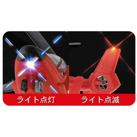 ●プロペラが回転すると飛行音が鳴り、前のライトが点灯、後ろのライトが点滅します。